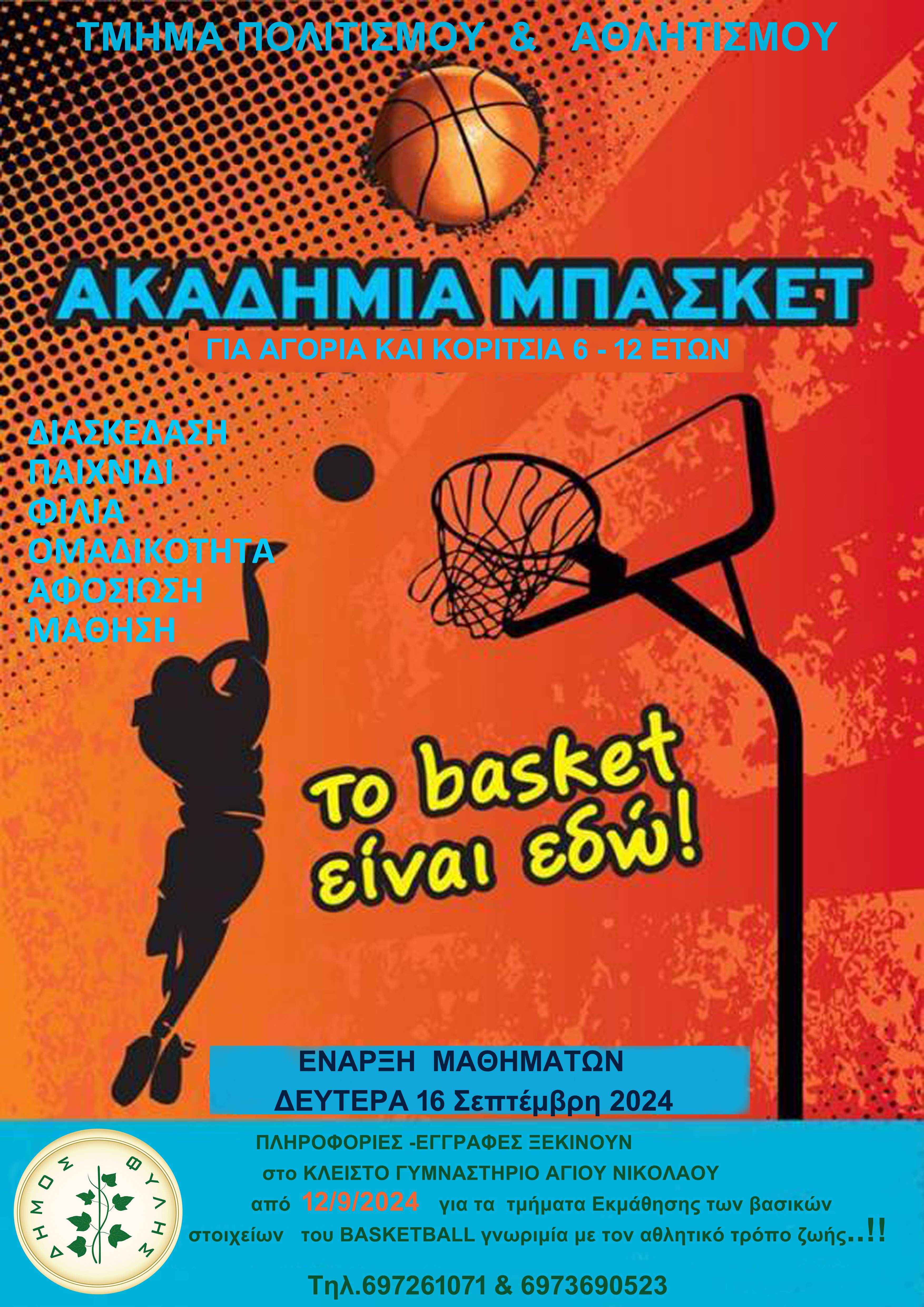 Ξεκινούν οι εγγραφές στην Ακαδημία Μπάσκετ του Δήμου Φυλής - 16 Σεπτεμβρίου η έναρξη των μαθημάτων